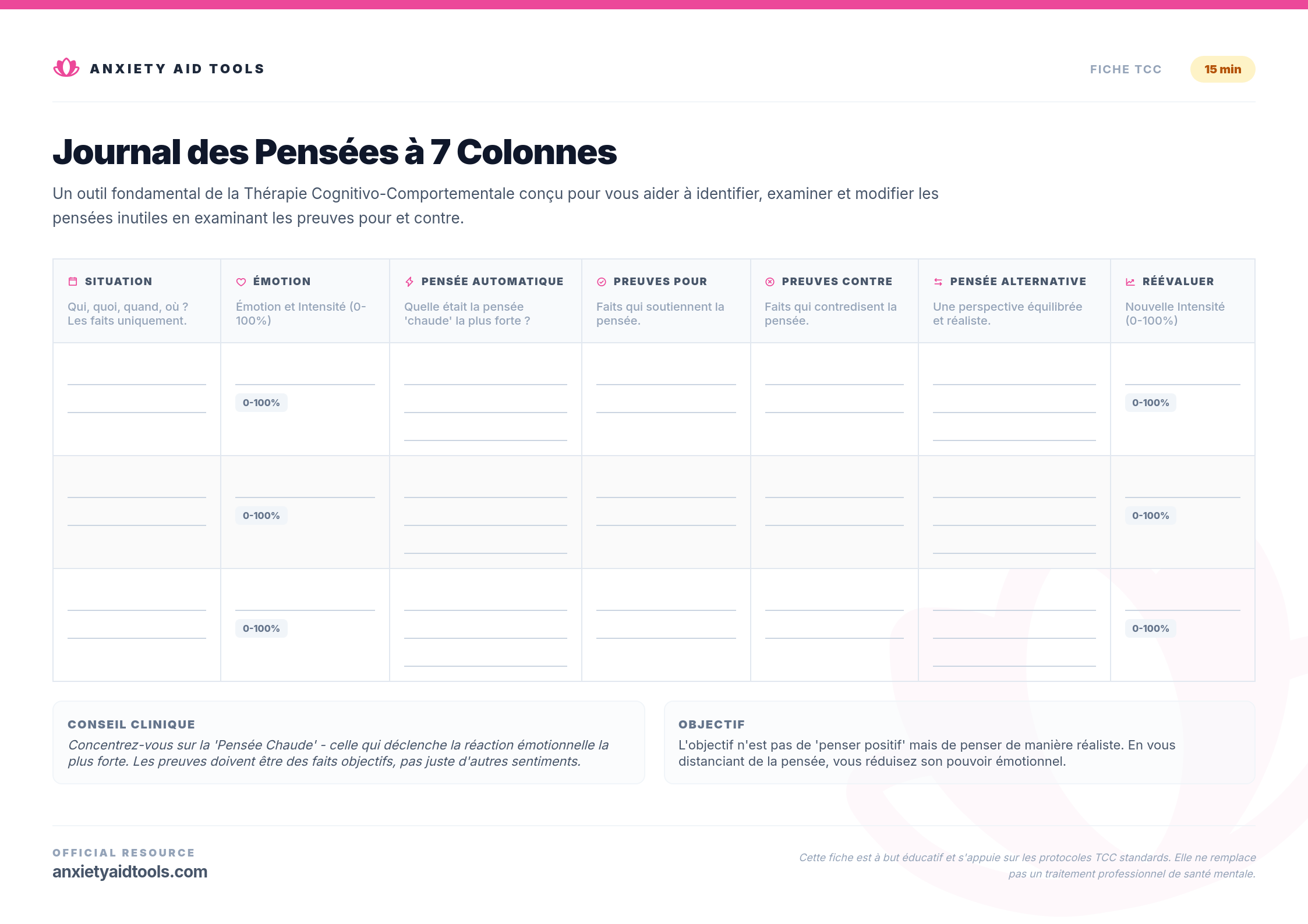 Le Journal des Pensées à 7 Colonnes est l'étalon-or de la Thérapie Cognitivo-Comportementale (TCC). C'est une méthode structurée pour évaluer les pensées qui déclenchent une détresse émotionnelle. En ralentissant et en écrivant les preuves pour et contre une pensée, vous pouvez passer du raisonnement émotionnel à la réalité objective.