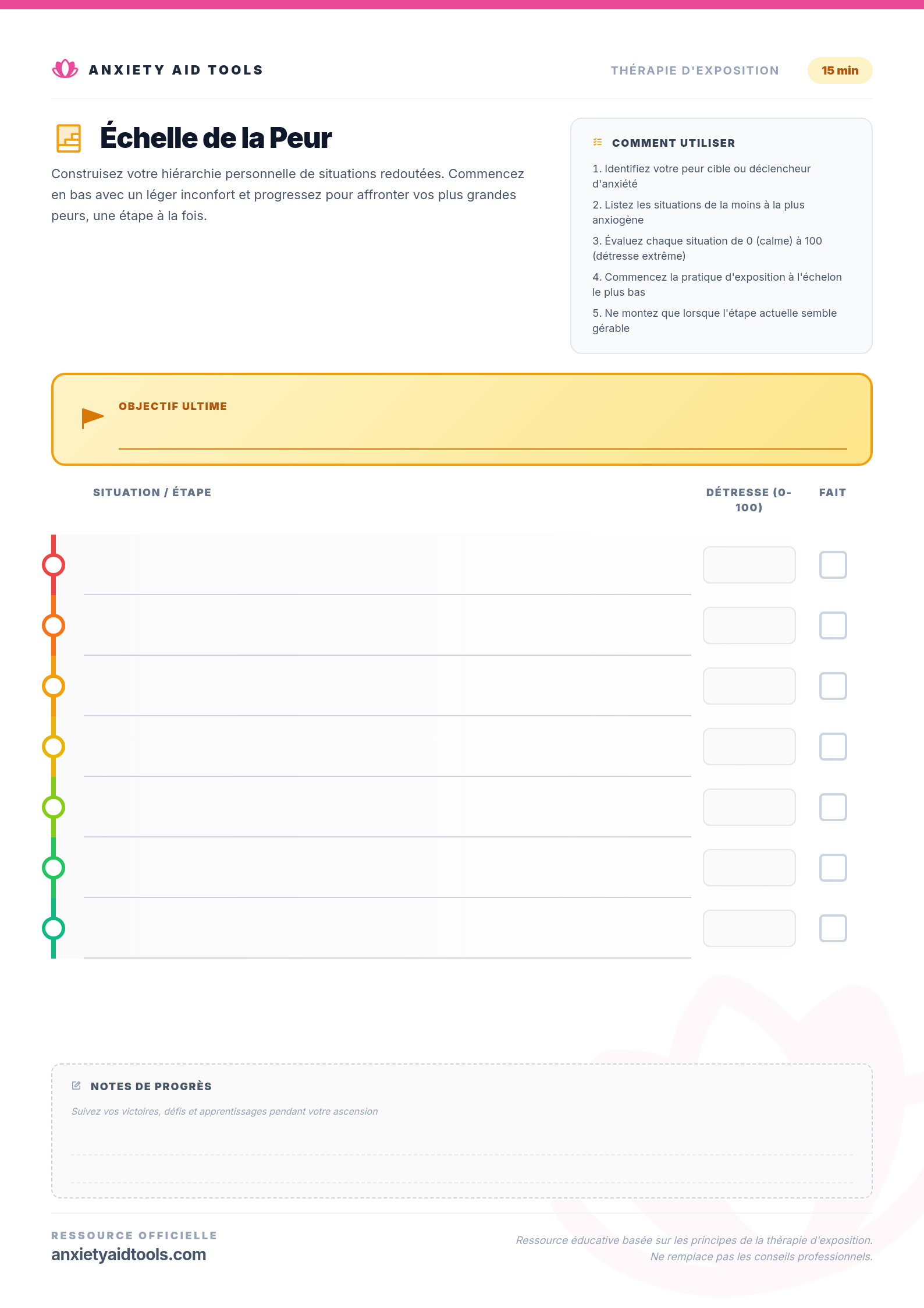 L'Échelle de la Peur (également appelée Hiérarchie d'Exposition) est une pierre angulaire du traitement de l'anxiété fondé sur des preuves. Elle fonctionne en décomposant une peur grande et accablante en étapes plus petites et gérables. En commençant par des situations qui ne causent qu'un léger inconfort et en progressant graduellement, vous entraînez votre cerveau à tolérer l'anxiété sans évitement.