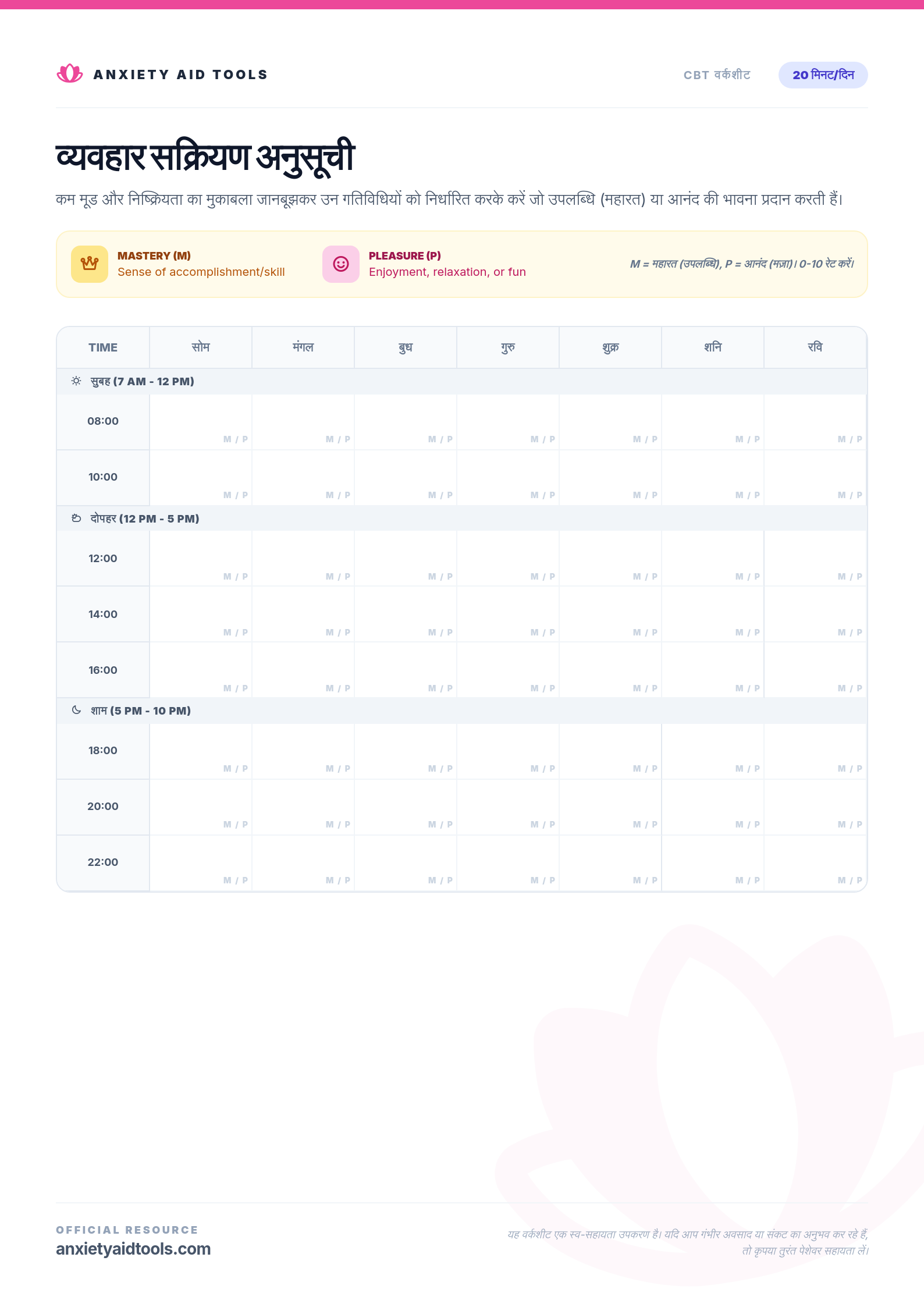 व्यवहार सक्रियण अनुसूची आपको अपने दैनिक जीवन में जानबूझकर गतिविधियों को फिर से शामिल करके इस चक्र को तोड़ने में मदद करती है। यह दो विशिष्ट प्रकार की गतिविधियों पर ध्यान केंद्रित करती है: महारत (ऐसी चीजें जो आपको सक्षम या उत्पादक महसूस कराती हैं, जैसे कमरा साफ करना या किसी कार्य को पूरा करना) और आनंद (मज़ा देने वाली चीजें, जैसे किताब पढ़ना या प्रकृति में टहलना)।