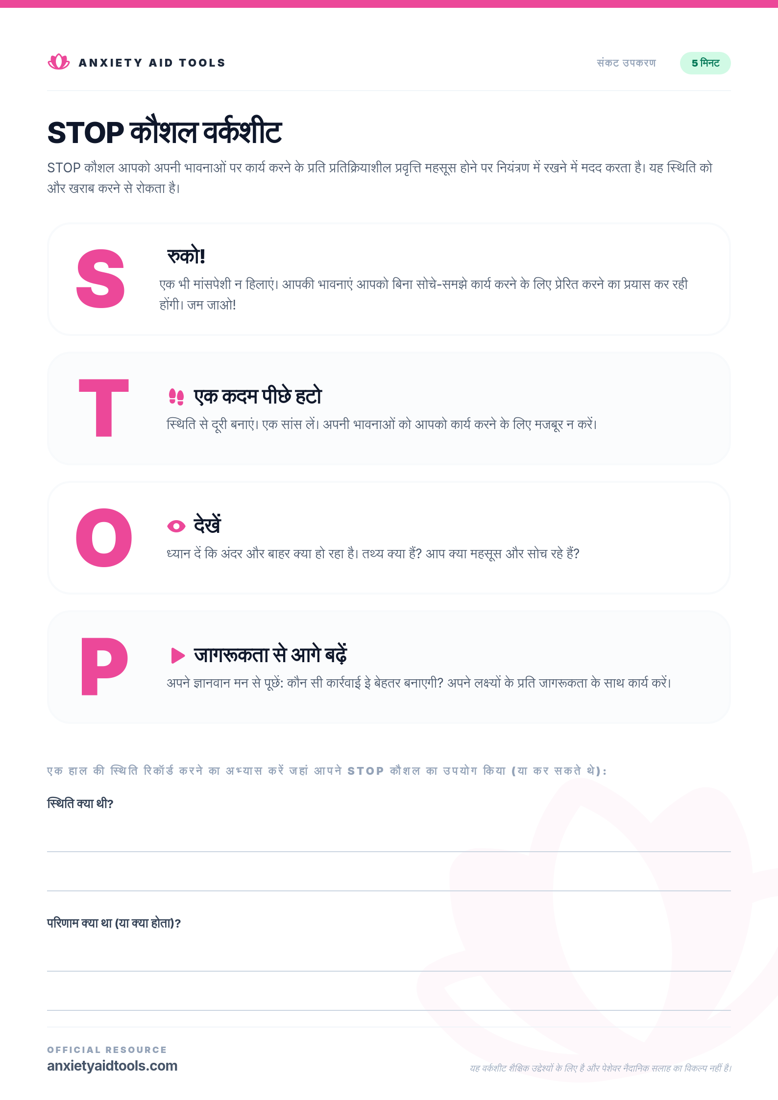 STOP कौशल एक मौलिक संकट सहिष्णुता उपकरण है जिसे ट्रिगर और आपकी प्रतिक्रिया के बीच 'अंतराल' बनाने के लिए डिज़ाइन किया गया है। उच्च भावनाओं के क्षणों में, हमारी प्राकृतिक प्रवृत्ति तुरंत प्रतिक्रिया करने की होती है, अक्सर ऐसे तरीकों से जो स्थिति को और खराब कर देते हैं (जैसे, बुरा संदेश भेजना, नौकरी छोड़ना, या पीछे हटना)।