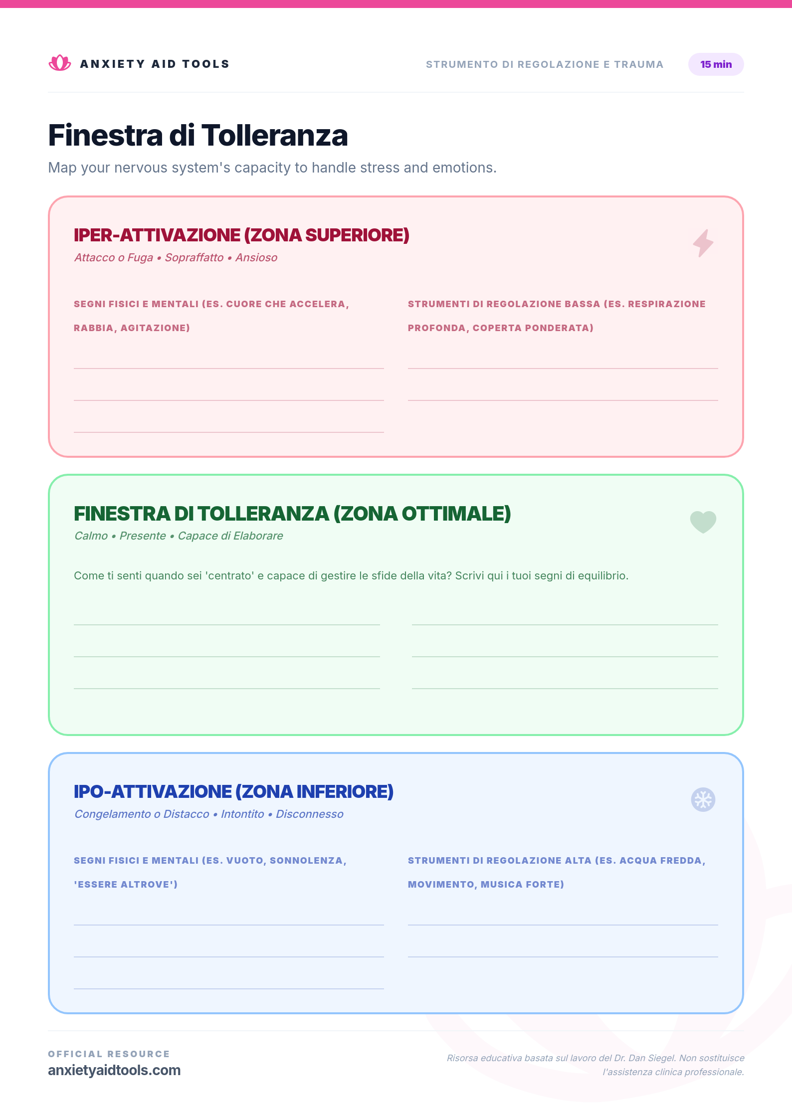 Identificando i tuoi trigger e sintomi personali, puoi individuare precocemente la disregolazione. La nostra scheda Finestra di Tolleranza offre uno spazio dedicato per elencare gli strumenti specifici che ti aiutano a tornare al tuo centro, sia che tu debba "regolare verso il basso" l'ansia o "regolare verso l'alto" dall'intorpidimento.