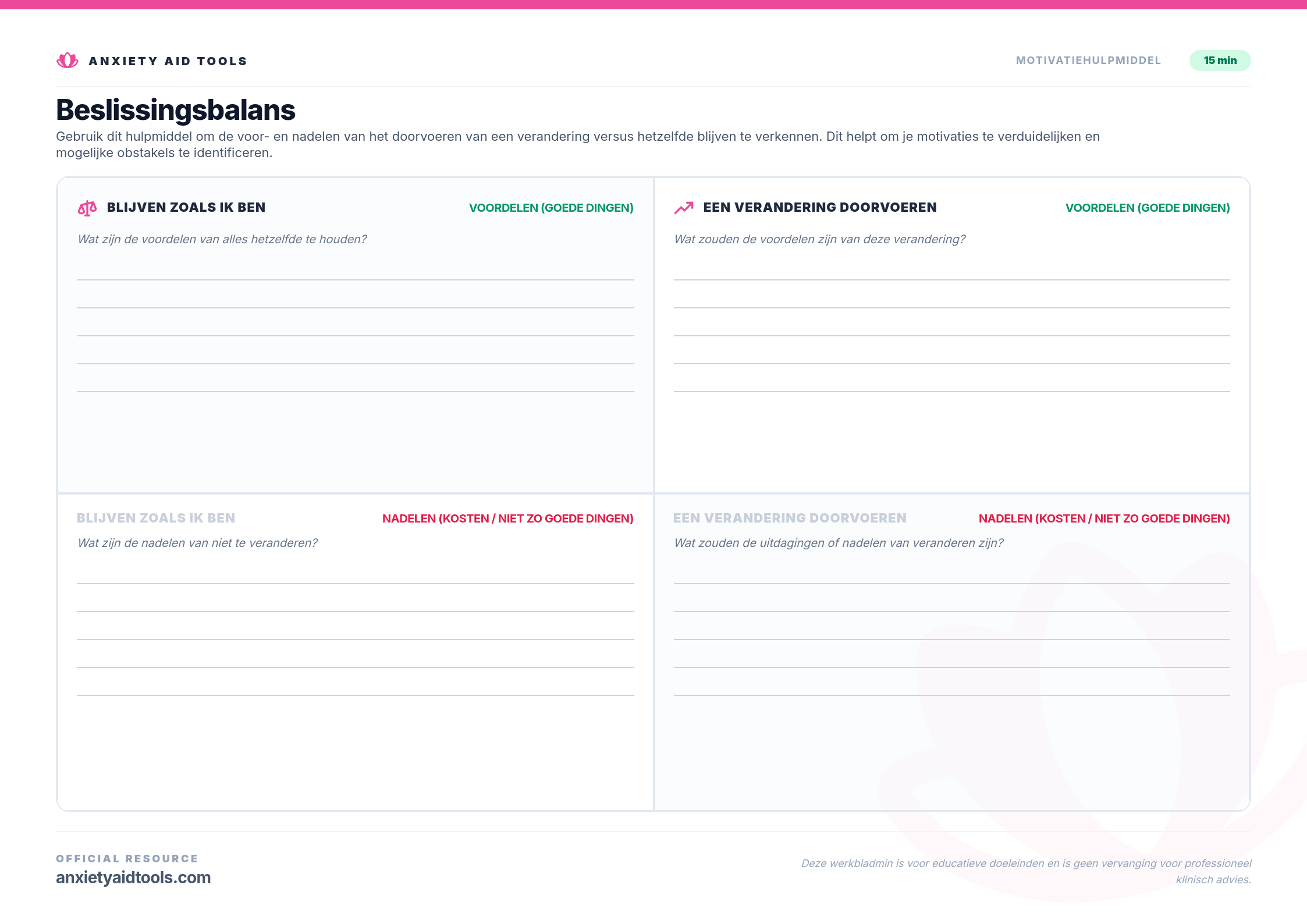 Het Beslissingsbalansblad is een krachtig hulpmiddel uit Motiverende Gespreksvoering (MI) ontworpen om je te helpen je ambivalentie te navigeren. Wanneer we een belangrijke verandering overwegen - of het nu gaat om het starten van een nieuwe gewoonte, het beëindigen van een relatie, of het veranderen van gedrag - voelen we ons natuurlijk in twee richtingen getrokken. Dit werkblad helpt je om dat interne conflict te externaliseren.