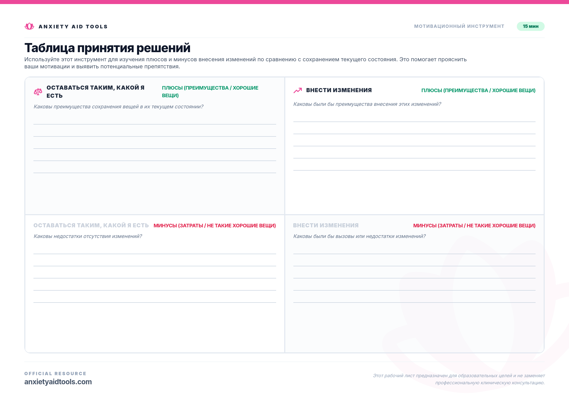 Лист Решающего Баланса - это мощный инструмент мотивационного интервьюирования (MI), разработанный для навигации по амбивалентности. Каждый раз, когда мы рассматриваем значительное изменение—начать новую привычку, закончить отношения или изменить поведение—мы естественным образом чувствуем притяжение в двух направлениях. Этот рабочий лист помогает вам вынести внутренний конфликт наружу.