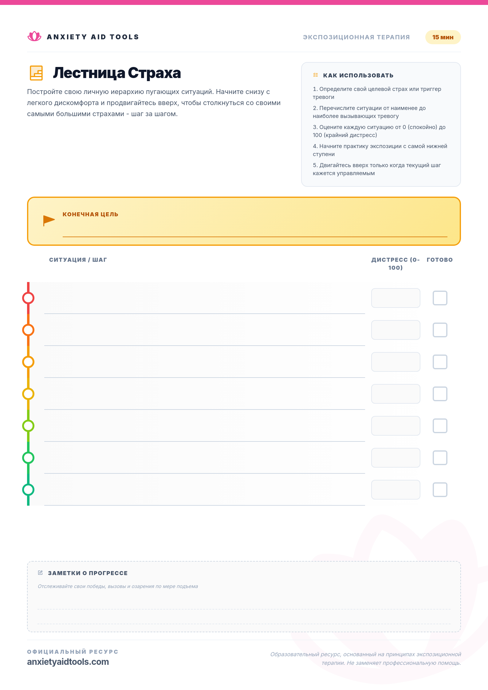 Лестница Страха (также называемая Иерархией Экспозиции) является краеугольным камнем доказательного лечения тревожности. Она работает, разбивая большой, подавляющий страх на меньшие, управляемые шаги. Начиная с ситуаций, вызывающих лишь легкий дискомфорт, и постепенно продвигаясь вверх, вы тренируете свой мозг терпеть тревогу без избегания.