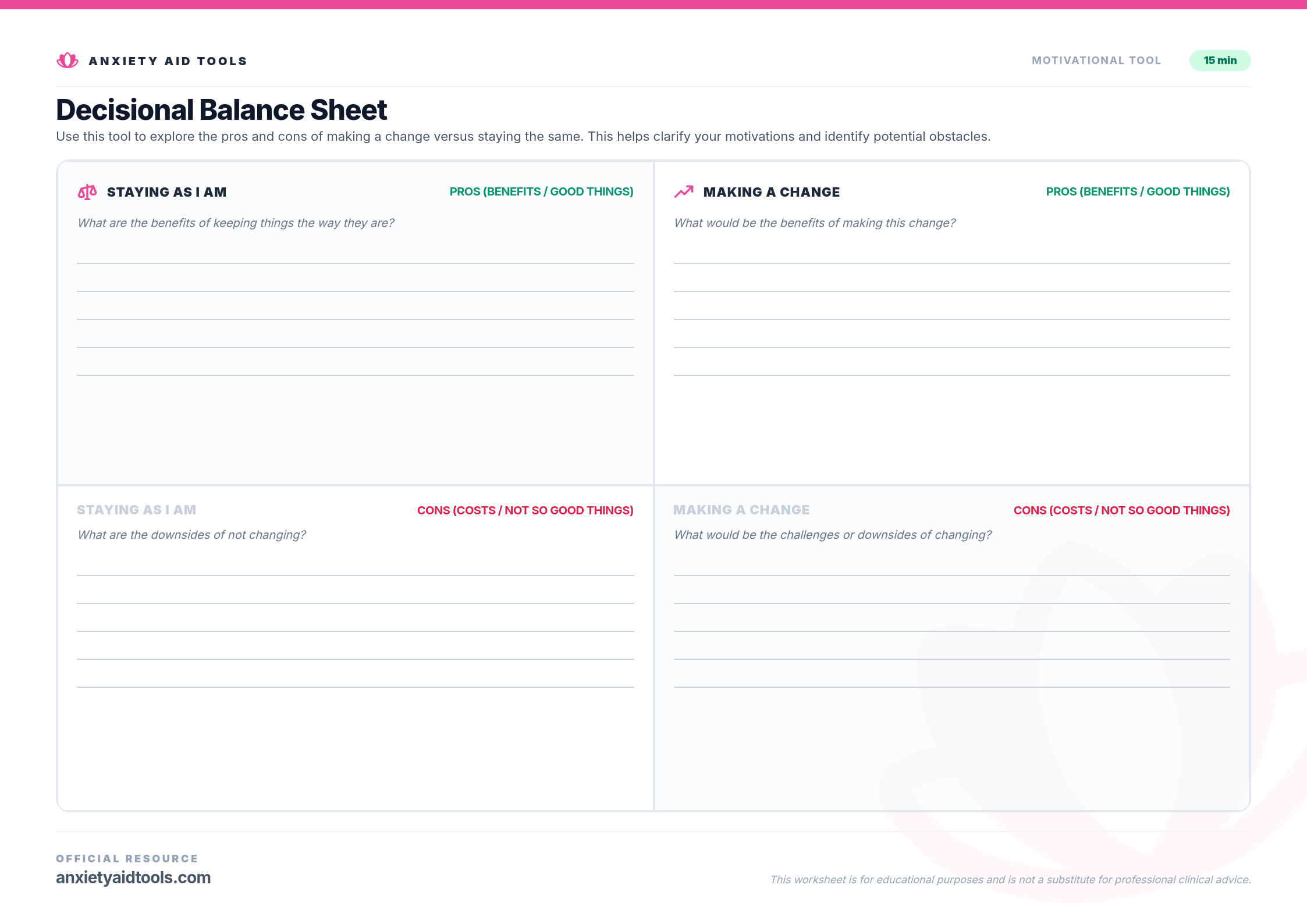 The Decisional Balance Sheet is a powerful tool from Motivational Interviewing (MI) designed to help you navigate ambivalence. Whenever we consider making a significant change—whether it's starting a new habit, ending a relationship, or changing a behavior—we naturally feel pulled in two directions. This worksheet helps you externalize that internal conflict.