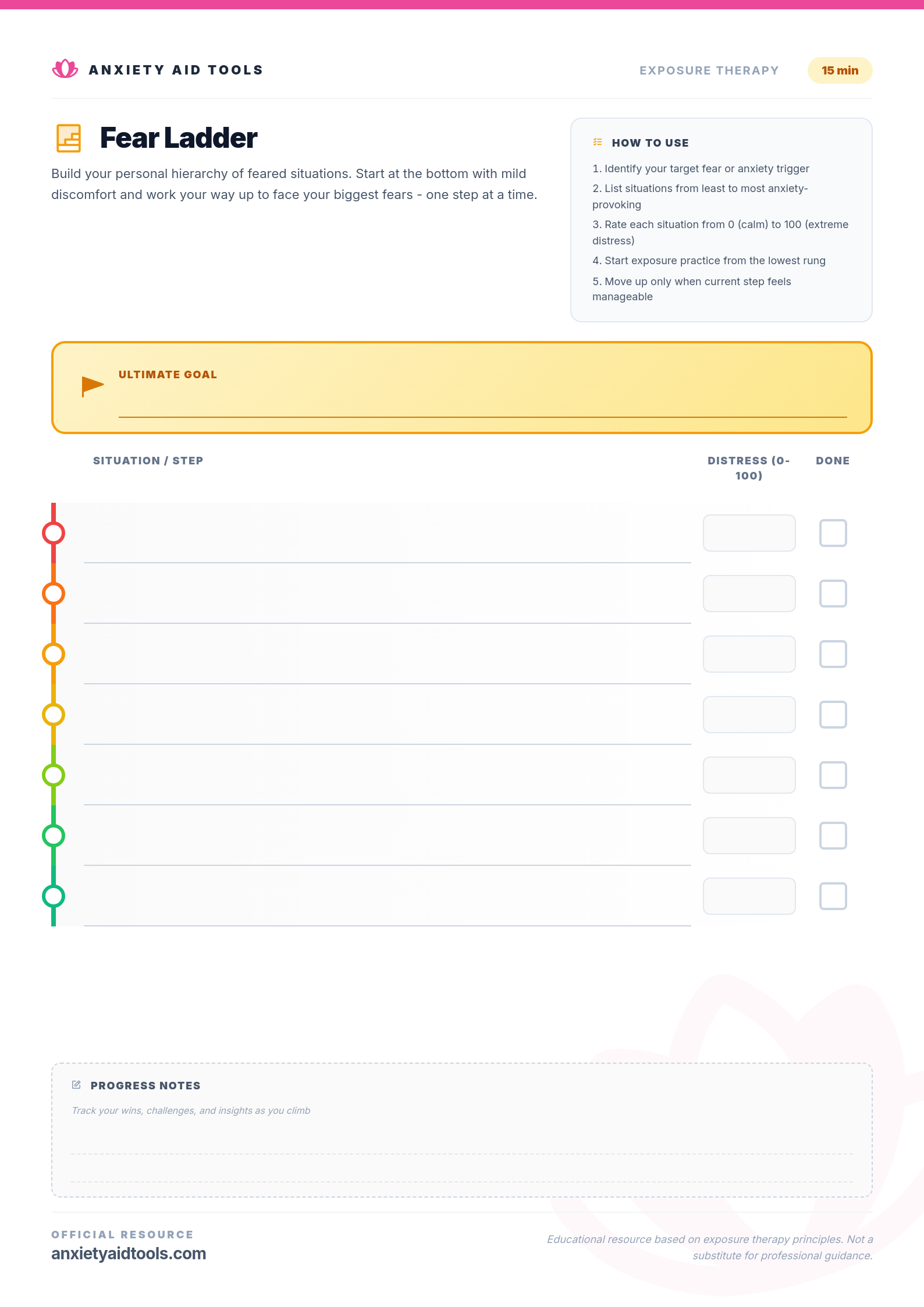 This worksheet helps you create a personalized roadmap for gradual exposure. Each 'rung' represents a specific situation or challenge, ranked by how much distress it causes (0-100). The color-coded ladder visually represents your journey from comfort (green) to your ultimate goal (red).