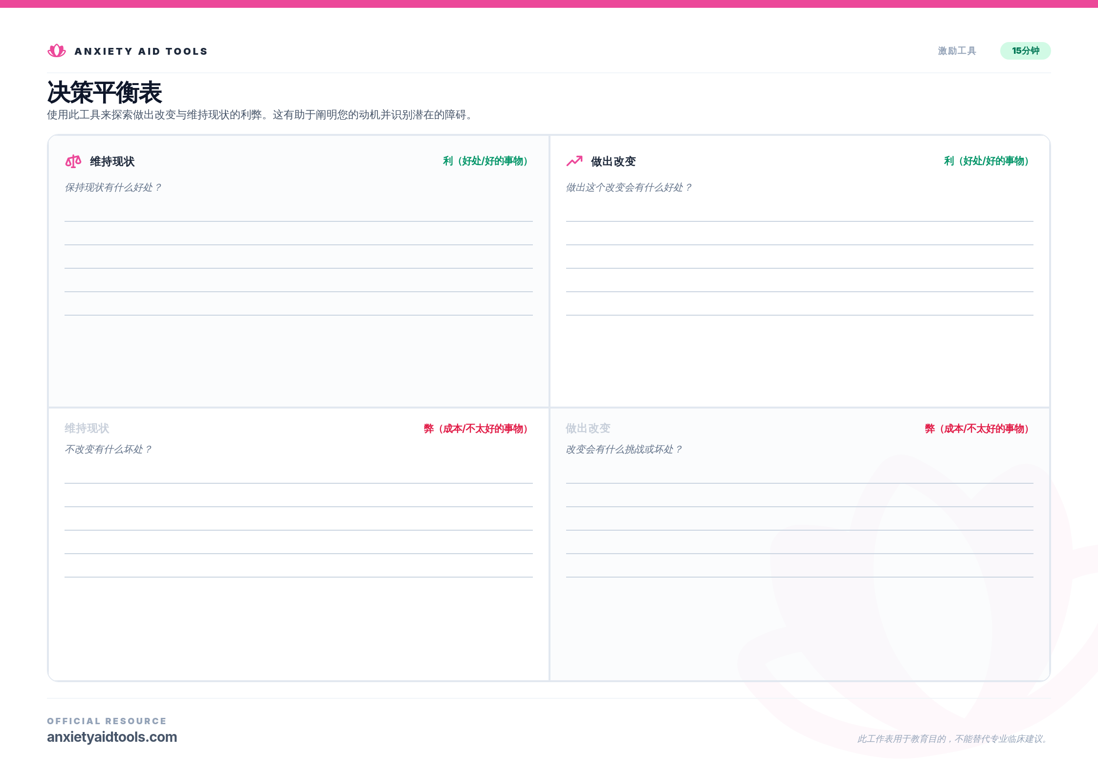 决策平衡表是动机性访谈(MI)中的强大工具,旨在帮助您应对矛盾心理。每当我们考虑做出重大改变时——无论是开始新习惯、结束关系还是改变行为——我们自然会感到被向两个方向拉扯。这个工作表帮助您将内心冲突外化。