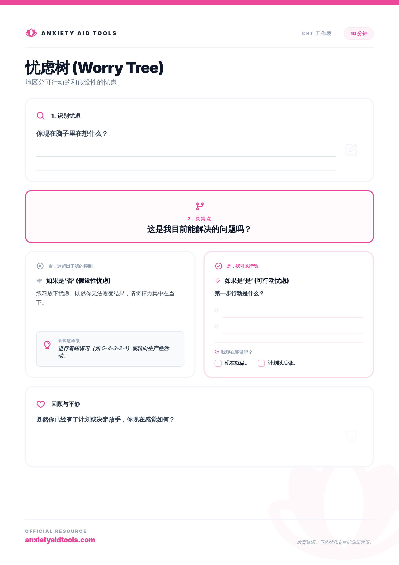 本工作表将引导你完成一个逻辑决策过程。通过问自己一个简单的问题——‘这是我目前能解决的问题吗?’——你可以对忧虑进行分类并应用正确的心理策略。如果答案是‘是’,我们就进入主动规划阶段。如果答案是‘否’,我们就练习重新聚焦和放手的艺术。